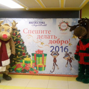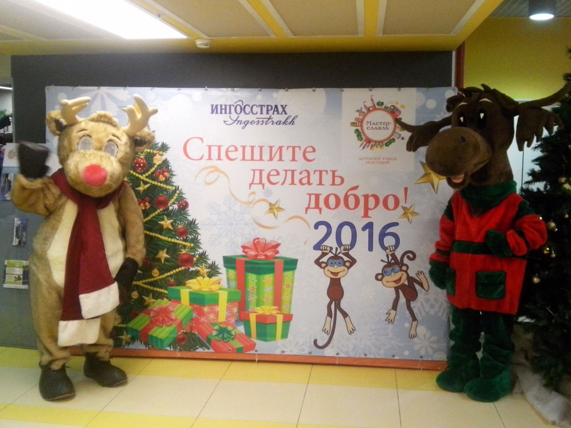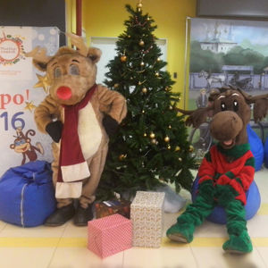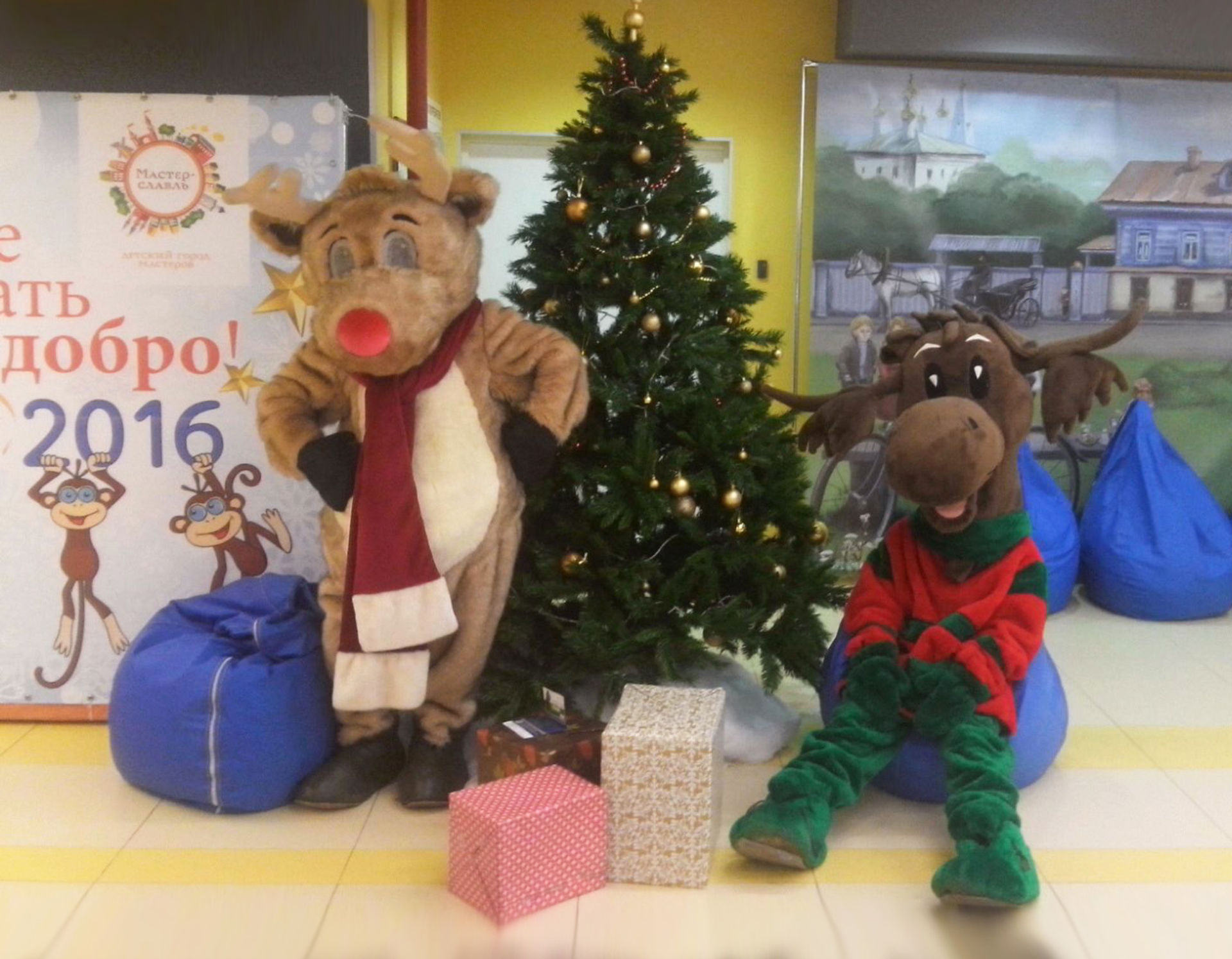 Веселый рождественский Лось и любимый олень Рудольф встречали гостей новогоднего праздника в детском городе мастеров Мастерславле. Забавные пушистые зверухи показывали дорогу к праздничному залу, развлекали малышей и фотографировались со взрослыми. Весь праздник прошел под лозунгом "Спешите делать добро!"
